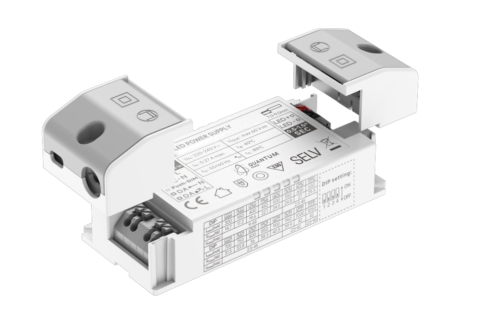 QPEC-DALI2-44-1050-EDS M is a 42w cconstant current LED driver with 700 to 1050mA output current and a forward voltage range from 9 to 52Vdc. The output current is selectable by DIP Switch. With it’s dimensions from 9 7 x 43 x 30mm it is easy to integrate in LED Panel, spot and down light products. To ensure trouble-free operation, protection is provided against output short circuit and over Load.